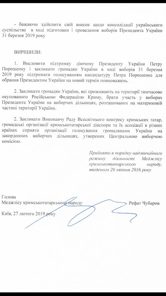 "После официальной регистрации Петра Порошенко кандидатом в президенты Украины решение, ранее принятое "за основу" было направлено членам Меджлиса для внесения ими возможных дополнений и изменений. С их учетом решение было принято и подписано 27 февраля", - сообщил Чубаров.