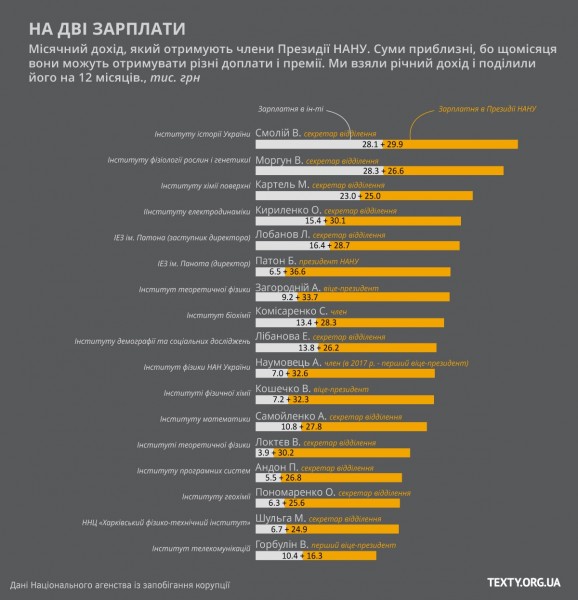 В 2017 году представители Президиума, включая президента НАНУ Бориса Патона и его первых заместителей суммарно получили из бюджета НАНУ более 2,5 миллиона гривен за свою работу в научных учреждениях. Этих денег хватило бы, например, чтобы целый год выплачивать зарплаты всем научным сотрудникам ГНУ НТК «Институт монокристаллов». Хотя на фоне общего бюджета НАНУ это - небольшая сумма.