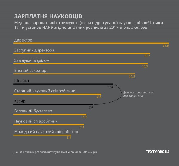 Мы проанализировали штатные расписания 17 институтов Академии наук, и подсчитали - средняя зарплата директора составляет 16 797 грн., заместителя директора - 15 010 грн., ученого секретаря - 13 294 грн., заведующего отделом - 14 284 грн., старшего научного сотрудника - 10 337 грн ., научного сотрудника - 7 427 грн., младшего научного сотрудника - 6 147 грн.