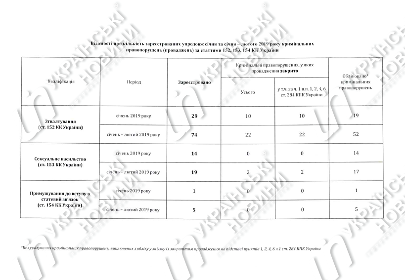 Ведутся расследования по 5 уголовным делам, квалифицированным по ст. 154 УК Украины - принуждение к вступлению в половую связь. Кроме того, за аналогичный период было открыто 17 производств по ст. 153 - сексуальное насилие и 52 дела - по ст. 152 (изнасилование).