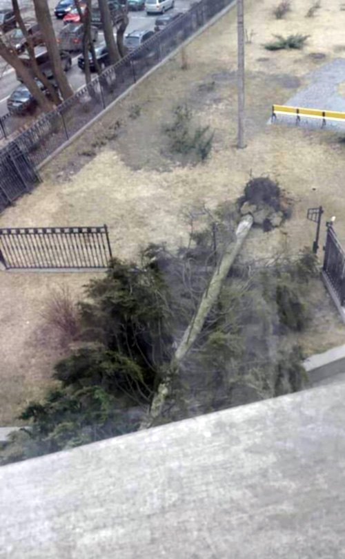 Сильные порывы ветра, которые наблюдаются сегодня в столице, сломали огромное хвойное дерево, которое упало прямо возле подъезда номер 1, через который на работу заезжает на авто с охраной спикер ВРУ Андрей Парубий.