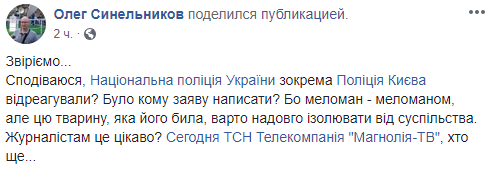"Звереем. Надеюсь, Национальная полиция Украины, в частности Полиция Киева отреагировали? Было кому заявление писать? Потому что меломан-меломаном, но эту тварь, которая его била, нужно изолировать от общества...", - прокомментировал Олег Синельников.