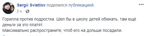 Мнения тех, кто не знаком с ситуацией, отличаются. "Горилла против подростка. Шел бы в школу детей обижать, там еще деньги за это платят. Максимально распространяйте, чтоб его на дольше посадили", - пишет Сергей Светлов.