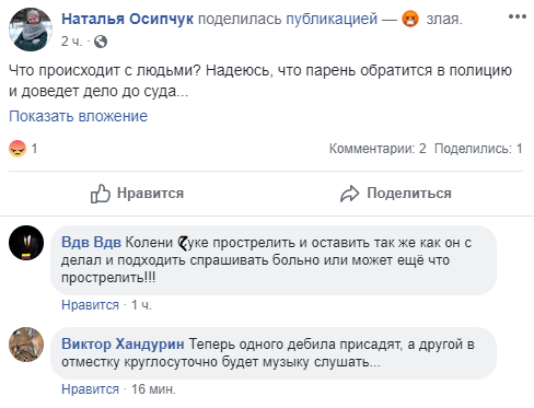 "Что происходит с людьми? Надеюсь, что парень обратится в полицию и доведет дело до суда", - отписалась Наталья Осипчук.