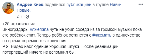 "...чуть не убил соседа из-за громкой музыки, пока его ребенок спит. Теперь ребенок останется с #яжемать в одиночестве на время тюремного заключения. ..Видео наблюдение хорошая штука. После реанимации потерпевший ничего не вспомнил бы", - уверен киевлянин Андрей.