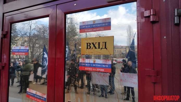 Вхід до НАБУ активісти обклеїли наліпками «Торгівля з окупантом – бізнес на крові».