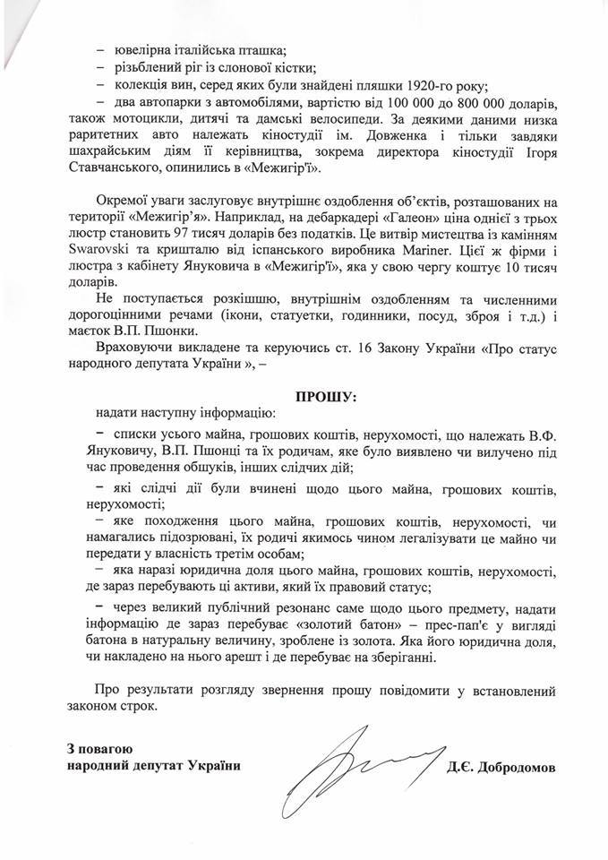 Продовжуючи роботу над з’ясуванням долі майна екс-чиновників часів Януковича, народний депутат Дмитро Добродомов направив депутатське звернення Генеральному прокурору України з проханням надати інформацію, де зараз перебувають виявлені у будинках Віктора Януковича та Віктора Пшонки предмети розкоші, зокрема двокілограмовий «золотий батон».