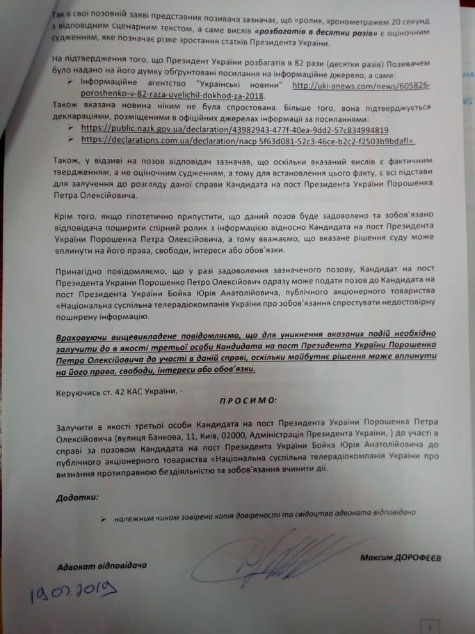 Ранее Юрий Бойко обратился в суд с иском о признании незаконным отказа НОТУ в размещении предвыборной агитации и требованием разместить в эфире ролик "Президент разбогател в десять раз, пенсионеры обеднели в два раза".