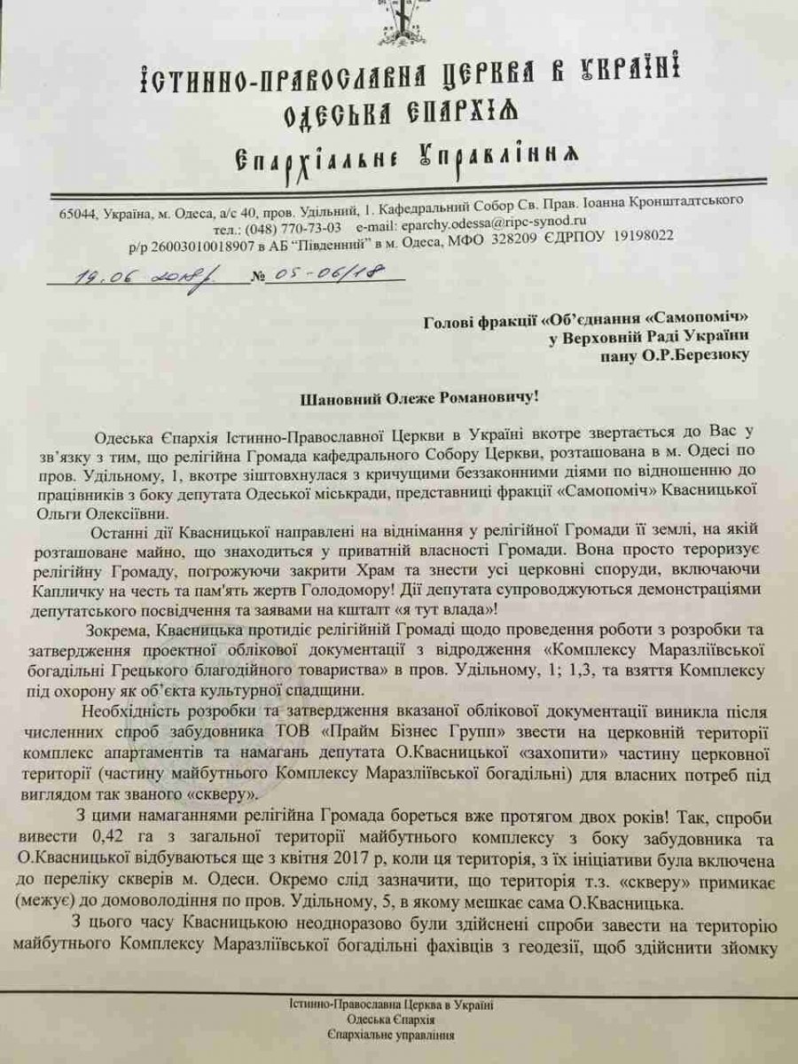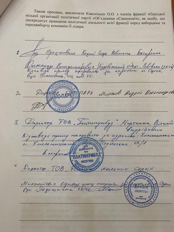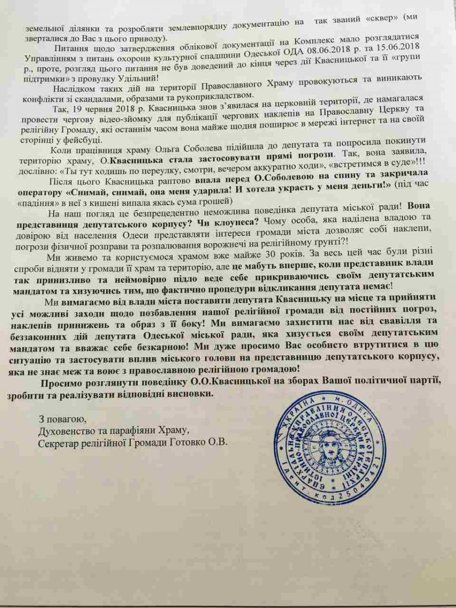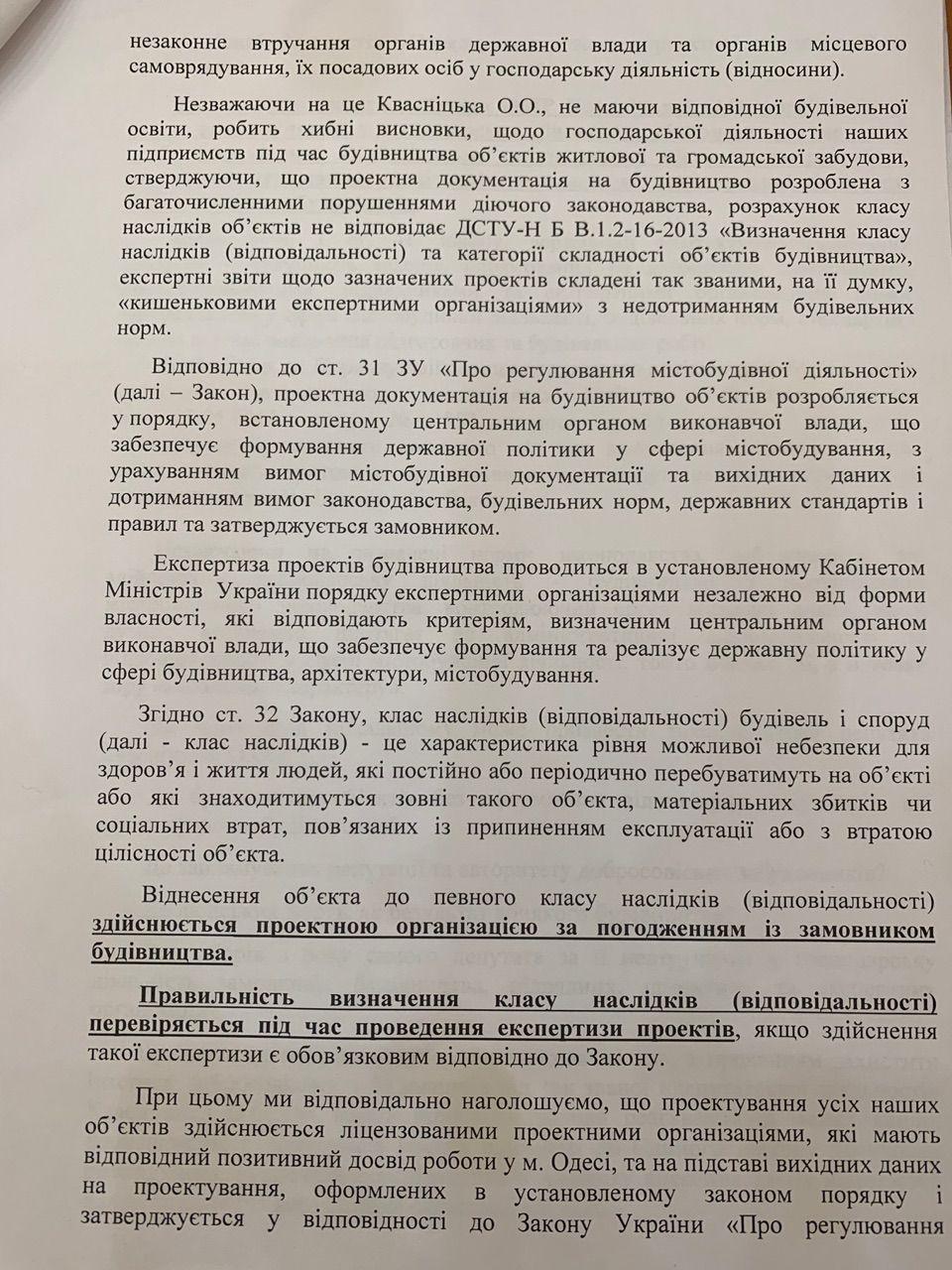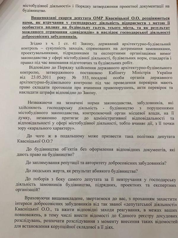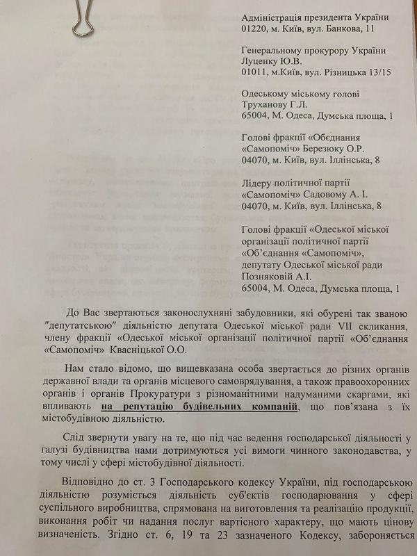 Зокрема, обурені забудовники звернулися до Президента України, Генпрокурора, до органів місцевої влади з проханням надати оцінку діям Квасніцької та зупинити її свавілля, яка вона прикриває мандатом депутата Одеської міської ради та членством у проєвропейській демократичній партії «Самопоміч».