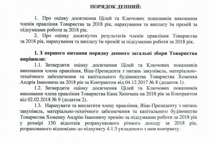 В документе указано, что за "достижение целей и ключевых показателей" премию в 150% расчетного годового дохода за 2018 год получит член правления, вице-президент по закупкам Андрей Хоменко. Он возглавлял "Укртрансгаз" с 3 мая 2018 года по 19 марта 2019 года. С 21 марта он стал главой Дивизиона технического обеспечения "Нафтогаза" и был предложен в обновленный состав правления НАК.