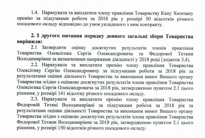 С 19 марта руководителем "Укртрансгаза" стал другой член правления - Сергей Алексеенко. Он также будет премирован за работу в 2018 году - премией размером в 141% годового оклада. Член правления Кан Хюнчан получит премию в размере 50% годового должностного оклада в соответствии с условиями заключенного с ним контракта. Премию в размере 150% годового оклада выписали и члену правления Татьяне Федоровой.