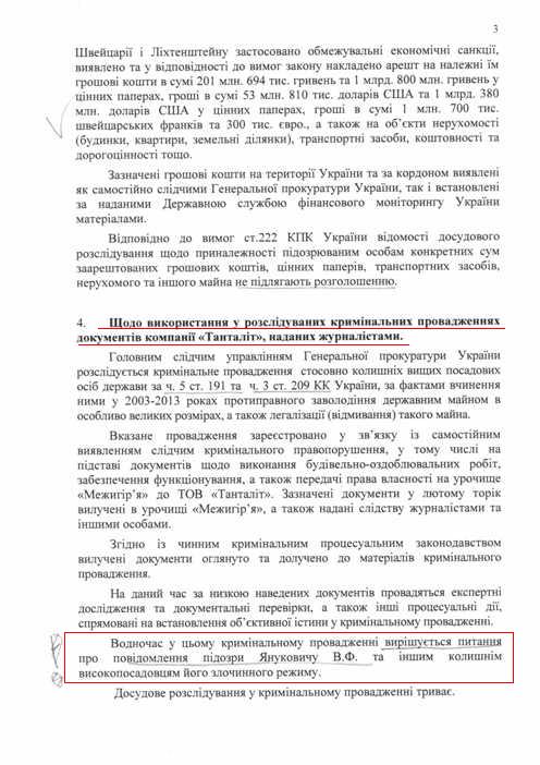 Кульмінацією нашого дослідження стали відомості Генпрокуратури, отримані на депутатське звернення. Виявляється, у справі передачі права власності на урочище "Межигір’я" до сумнозвісного ТОВ "Танталіт" питання про повідомлення підозри біглому господарю цього символу корупції Віктору Януковичу ще й досі... вирішується!