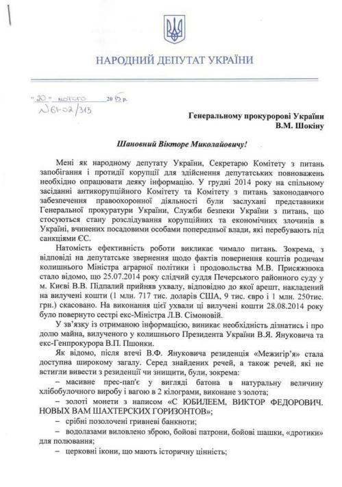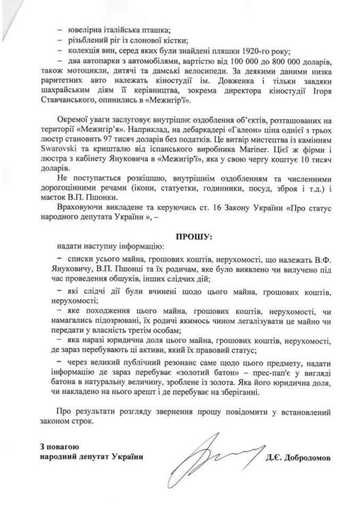 У пошуках арештованого майна екс-чиновників часів Януковича, зараз скерували депутатське звернення новому Генпрокурору В. Шокіну з проханням надати детальну інформацію, де зараз знаходяться виявлені у будинках В. Януковича та В. Пшонки предмети розкоші, зокрема "легендарний" двокілограмовий "золотий батон", котрий став символом колишньої влади. Не здивуюся, що і його могли повернути родичам, наприклад, коханки екс-президента Любові Полежай. А раптом якийсь суддя визначив, що ця річ належить саме їй? Адже сьогоднішню локацію "золотого батону", як і про місце знаходження інших речей з особняків колишніх можновладців, офіційних відомостей немає. Нагадаю, що окрім цінностей у "Хонці" виявили вартісну колекцію вин, два автопарки з автомобілями, вартістю від 100 000 до 800 000 дол. за кожен. Та багато чого іншого.
