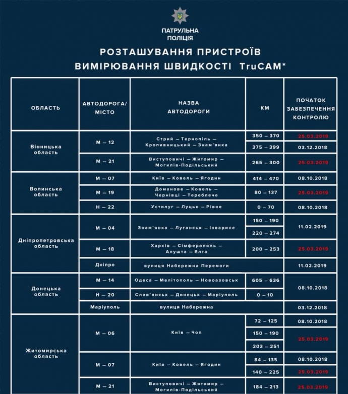 Где в Украине с 25 марта появились новые радары полиции TruCAM. Карта