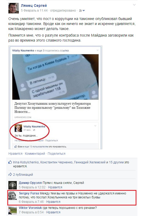 Также якобы Хомутыннику обязан своим назначением руководивший таможней с марта по июнь 2014 года Виталий Науменко. Правда, как свидетельствует один из комментаторов в Facebook, вскоре по той же схеме таможенника “ушли”.