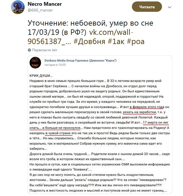 В частности, о гибели Довбни рассказали в одной из групп в запрещенной в Украине соцсети Вконтакте.