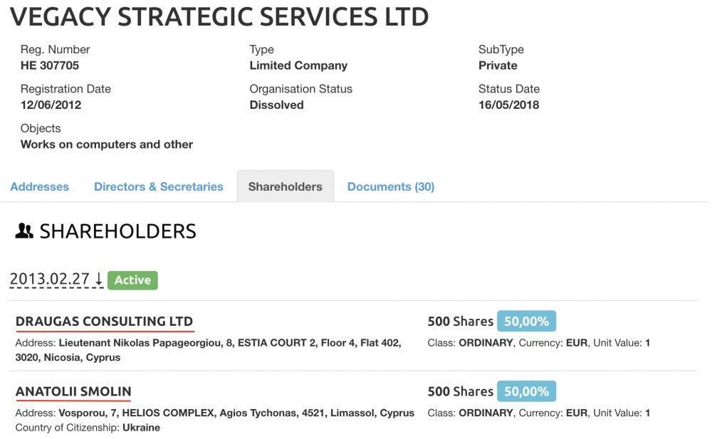 Vega Strategic Services занималась охраной на кораблях и предлагала услуги по обеспечению безопасности частным лицам, а также компаниям. Спустя год компания сменила название на Vegacy Strategic Services Ltd, а местом ее регистрации значился Кипр. В реестре компаний указано, что ее возглавлял гражданин Украины Анатолий Смолин.
