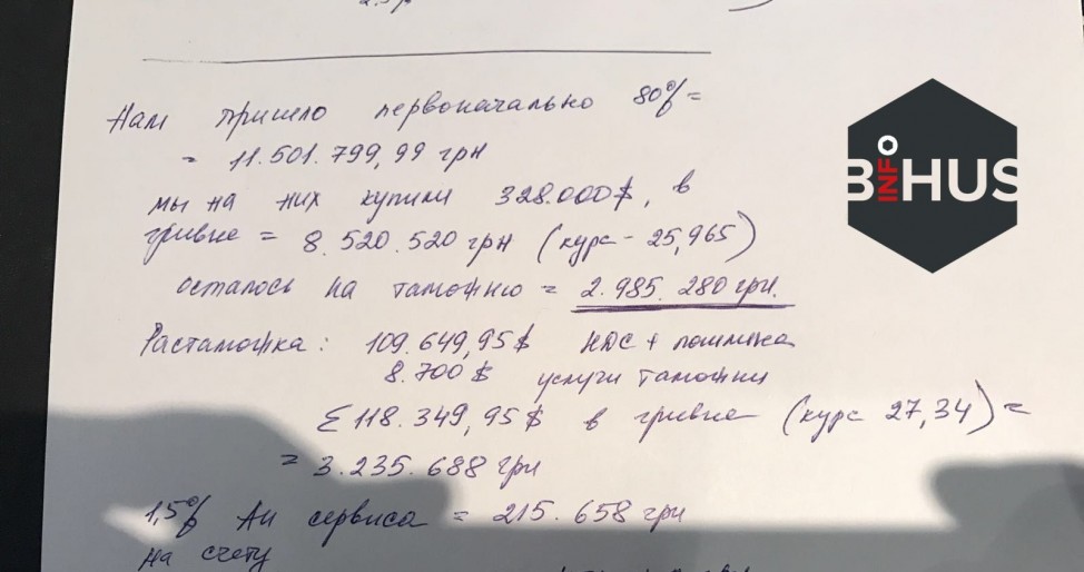 Зрештою саме Хош надсилав Жукову (з припискою «Вот математика») папірці з розрахунками – бухгалтерією афери. З його «математики» видно, що державний концерн заплатив 580 тис дол за товар, чиста вартість котрого – 85 тис дол (з витратами на доставку – 120 тис дол), тобто переплатив у 5 разів, натомість після вирахування усіх витрат на митницю, транзитні фірми й обналку – чистий прибуток групи Жукова-Гладковського від цієї афери склав 300 тисяч доларів.