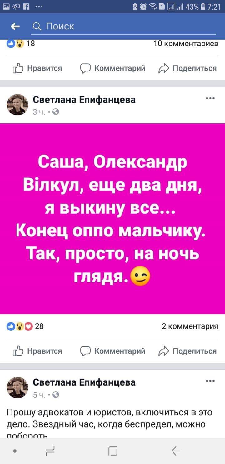 Об этом она написала сразу несколько постов на своей странице в Facebook. Епифанцева пишет, что Вилкул неоднократно изменял своей жене Елене, а некогда домогался и саму Светлану. Она пообещала также предоставить доказательства аморального поведения Александра Вилкула, но спустя некоторое время Светлана Епифанцева удалила свой пост — вероятно из-за угроз в свой адрес. Попытки уточнить информацию также успехом не увенчались — Епифанцева ограничила количество людей, которые могут ей звонить.