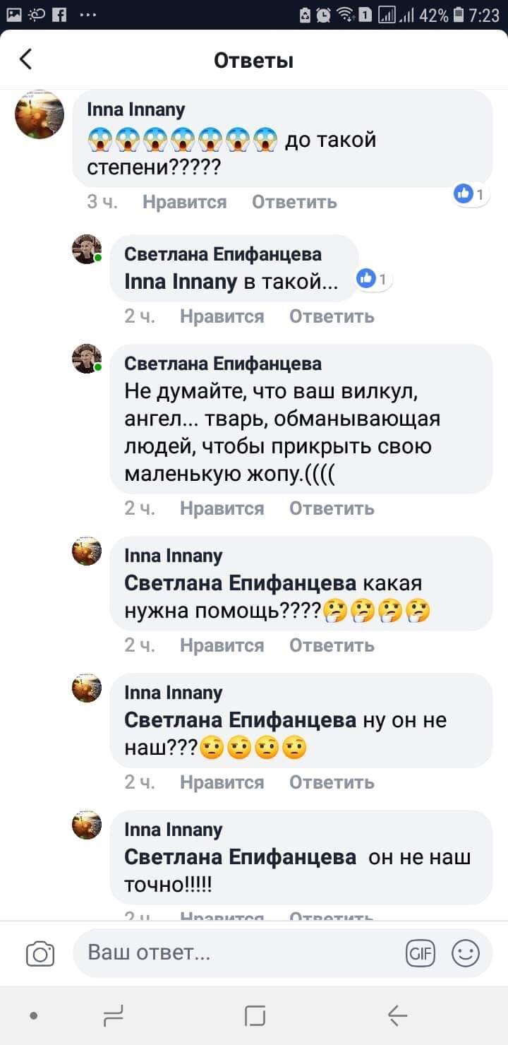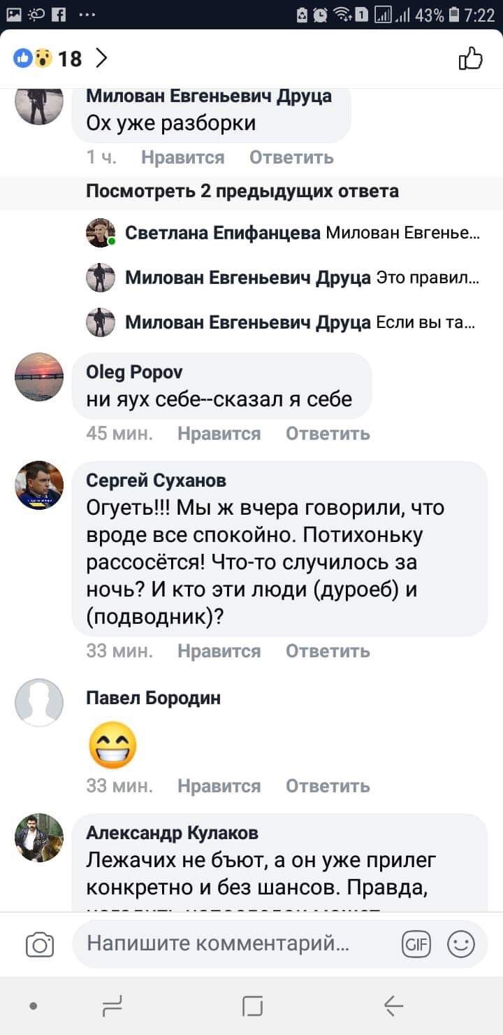 Оксаны муравьевы, аля , одноклассницы Вилкула.,( этот дуро*б понял, что она Гончаренко), кстати, подводник с тебя ржет… говорит , что опять пи*дят деньги у вилкула))), ну то ваши проблемы,сорри Наташа. (…) Скот ты , санька, мелкий, нюхающий кокаин…Ты меня домогался есть видео, нужно??», — написала Светлана Епифанцева на своей страничке в Facebook.