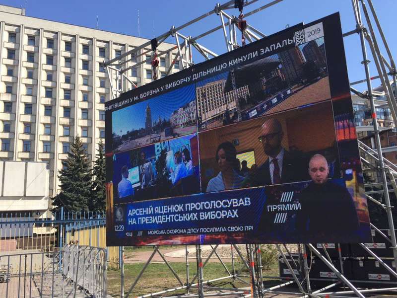 На территории перед ЦИК установлен большой монитор, по которому транслируют телеканал «Прямой». Вдалеке находятся полицейские.