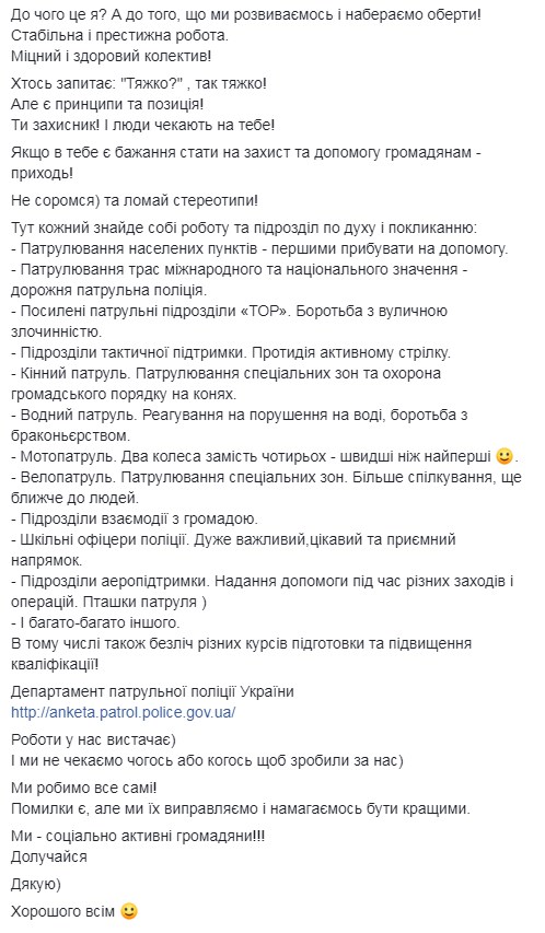 Также замглавы патрульной полиции указал, что решается вопрос с обеспечением правоохранителей жильем.