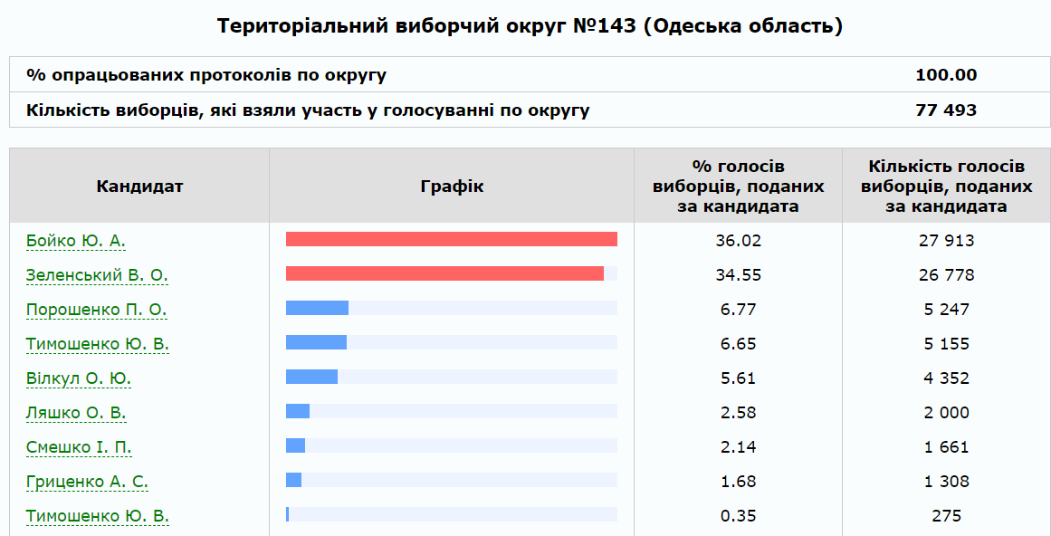Действительно, на округе № 143 в Одесской области обработано уже 100% протоколов. Здесь побеждает Юрий Бойко (36.02%), на втором месте - Владимир Зеленский (34.55%), тройку лидеров замыкает Петр Порошенко(6.77%). За ним - Тимошенко с 6,65%. А замыкает пятерку лидеров Вилкул с 5,61% голосов избирателей.