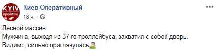 Уточняется, что мужчина потерпел такую неудачу, пытаяся выйти из салона троллейбуса и взявшись за поручень двери. Инцидент произошел в понедельником, 1 апреля. "Лесной массив. Мужчина, выходя из 37 троллейбуса, захватил с собой дверь. Видимо, сильно приглянулась", - говорится в сообщении.