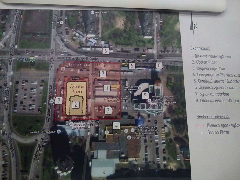 Согласно письму Департамента по вопросам государственного архитектурно-строительного контроля КГГА от 13.02.2019 года №073-1435, этот департамент зарегистрировал заказчику строительства - ООО “Соллур” - декларацию о начале выполнения подготовительных работ по строительству многофункционального комплекса в составе заведений общественного питания, торговли, офисных помещений, жилых помещений и подземного паркинга на пересечении ул. Маршала Малиновского и просп. Оболонского в Оболонском районе Киева 22.12.2018 года (№КВ 010 183 560 063).
