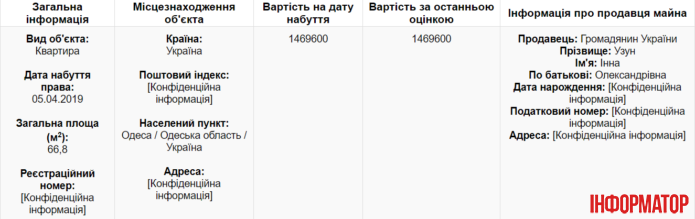 8 квітня вона задекларувала подарунок у негрошовій формі від громадянки України на прізвище Узун. Це – квартира в Одесі площею 66,8 квадратних метра вартістю 1 мільйон 469 тисяч 600 гривень.