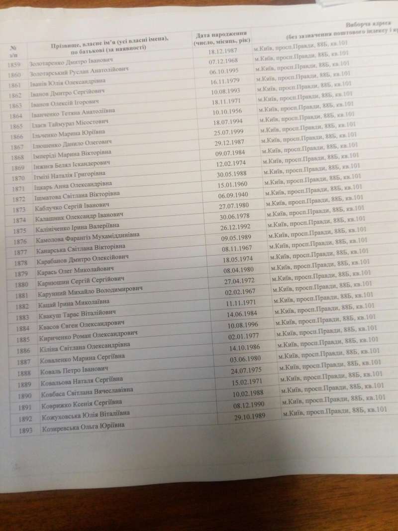 Как сообщалось в пресс-службе ВО “Батькивщина”, “в Киеве на избирательном округе №220 обнаружены квартиры, в которых прописаны сотни человек. В частности, по адресу ул. Бондарская, 3, кв. 104 были зарегистрированы 380 человек, что составляет 25% всех избирателей, зарегистрированных на избирательном участке №801095”.