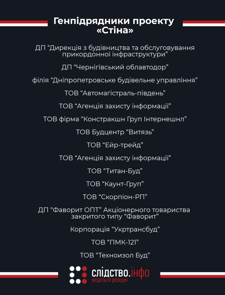 Несмотря на всю «секретность» строительства «Стены», Госпогранслужба называет компании, которые ее строят. Слідство.Інфо получило перечень генподрядчиков за все время строительства. Более четырех лет пограничники отдавали главные подряды компаниям, связанным с народными депутатами Дмитрием Шенцевым, Юрием Павленко и семьей нардепа Бронислава Розенблатта. Вероятно, среди генподрядчиков есть и фирмы, специально созданные под проект «Стена».