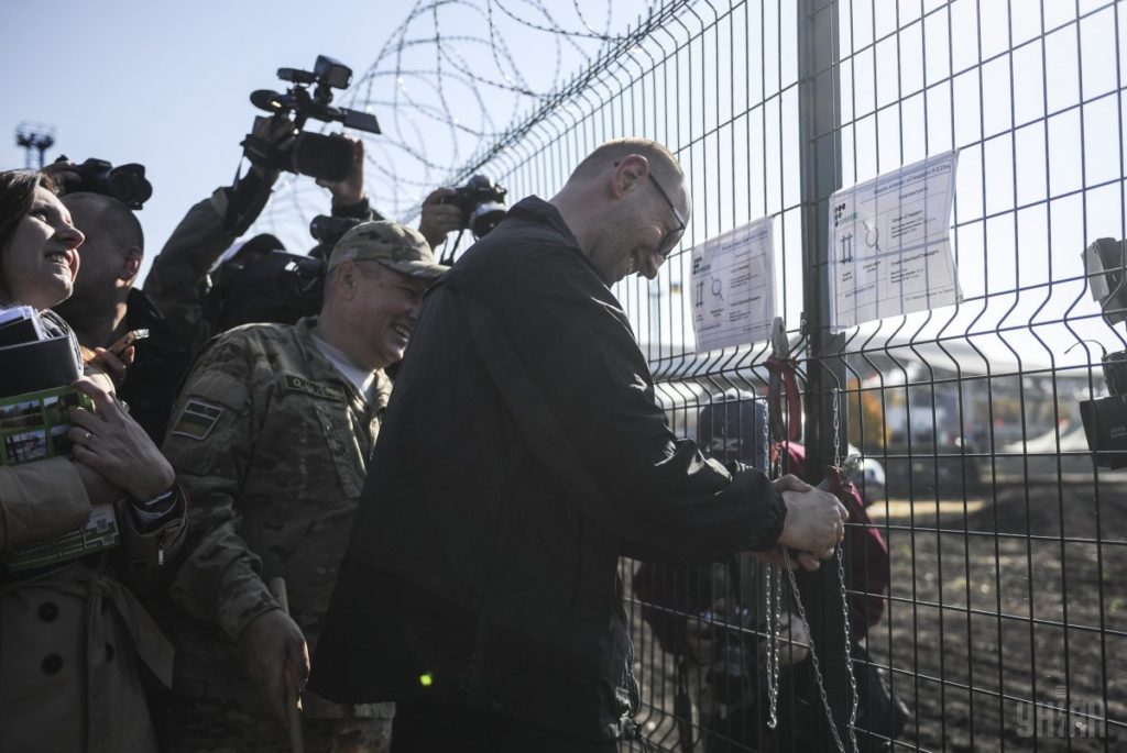 Тогдашний премьер-министр Украины Арсений Яценюк в рамках рабочего визита в Харьковскую область знакомится с ходом реализации проекта обустройства российско-украинской государственной границы «Стена», 15 октября 2014 года. Андрей Кравченко / POOL / УНИАН