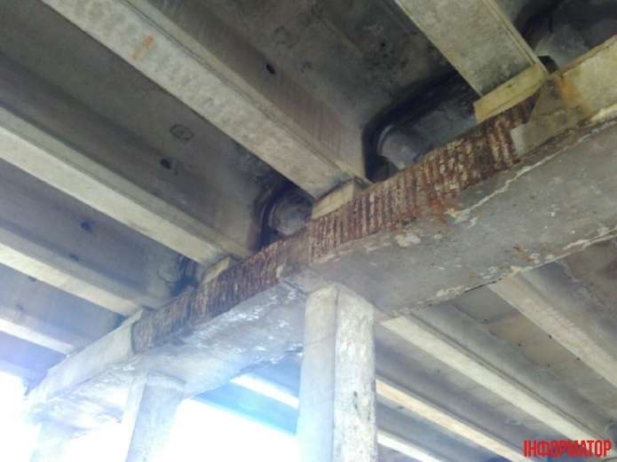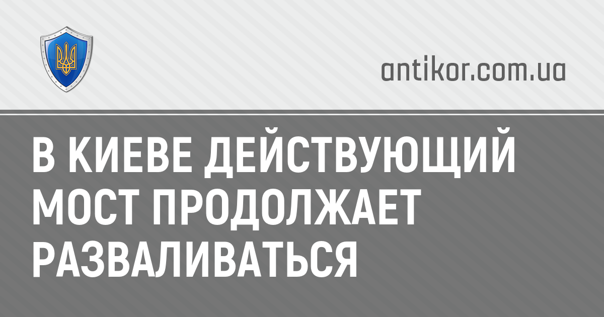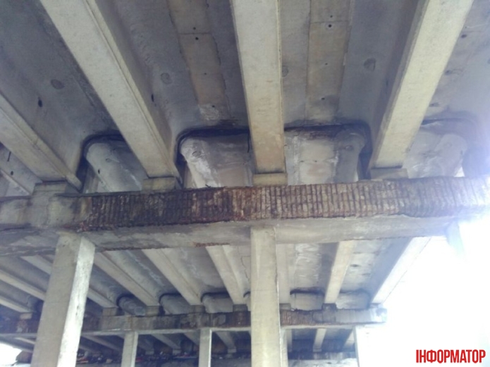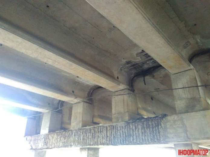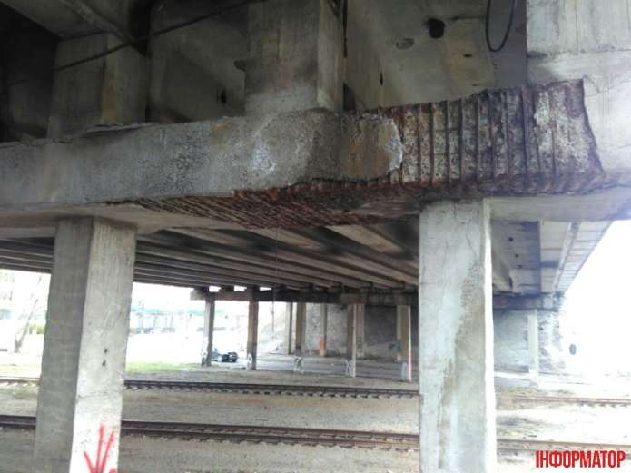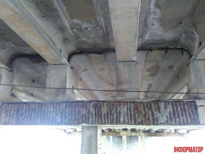 В Киеве продолжает рассыпаться действующий мост. Из-за того, что конструкция осыпается, оголяется и ржавеет арматура, вследствие чего железно-бетонная конструкция теряет свои прочностные свойства, что создает угрозу обрушения моста.