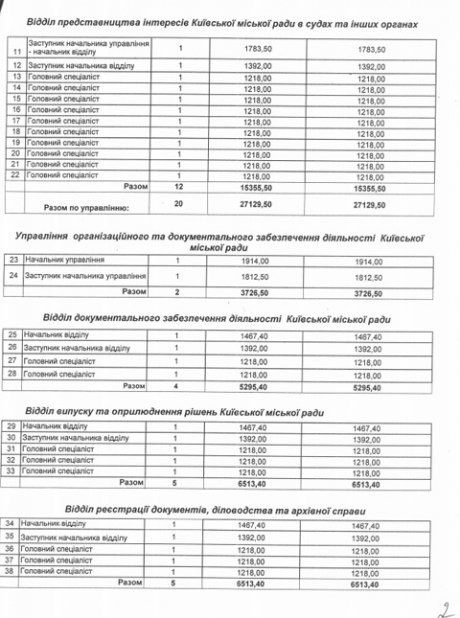 Начальники управлінь Київради (їх 9) мають зарплату 1914 гривень, а їх заступники 1812,5 гривні.