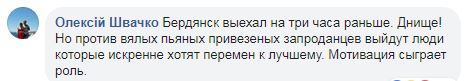 “Бердянск выехал на три часа раньше. Днище! Но против вялых пьяных привезеных запроданцев выйдут люди которые искренне хотят перемен к лучшему. Мотивация сыграет роль”, – написал Алексей Швачко.