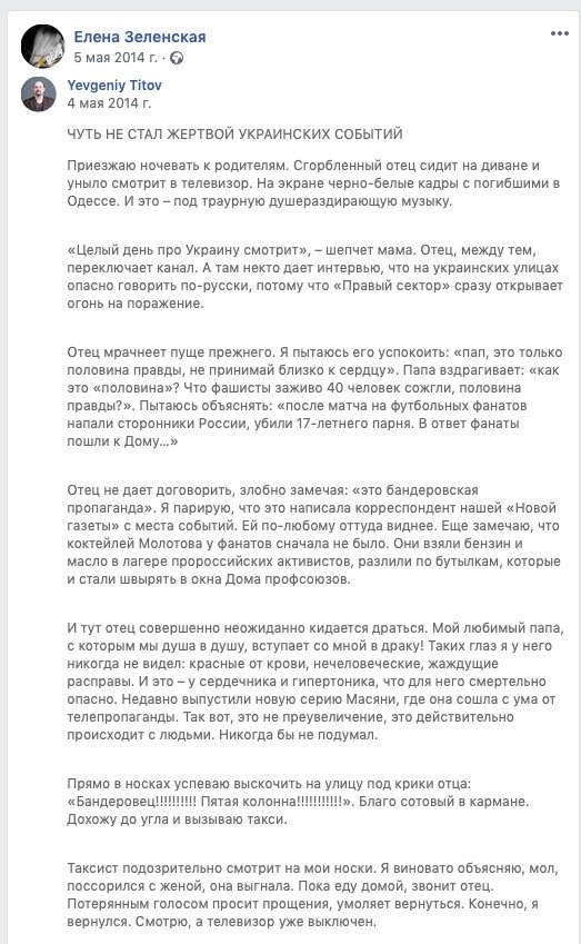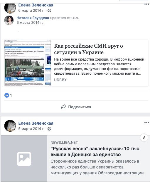 Отметим, что станица Зеленской содержит множество публикаций за 2014 год, которые не говорят о ее пророссийской позиции. Она публиковала материалы разоблачающие пропаганду РФ и призывы к Путину не трогать Украину.