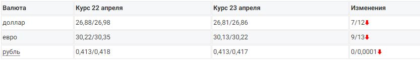 Во вторник, 23 апреля, в банках доллар подешевел в покупке и в продаже на 15 копеек, а евро — на 20 копеек.