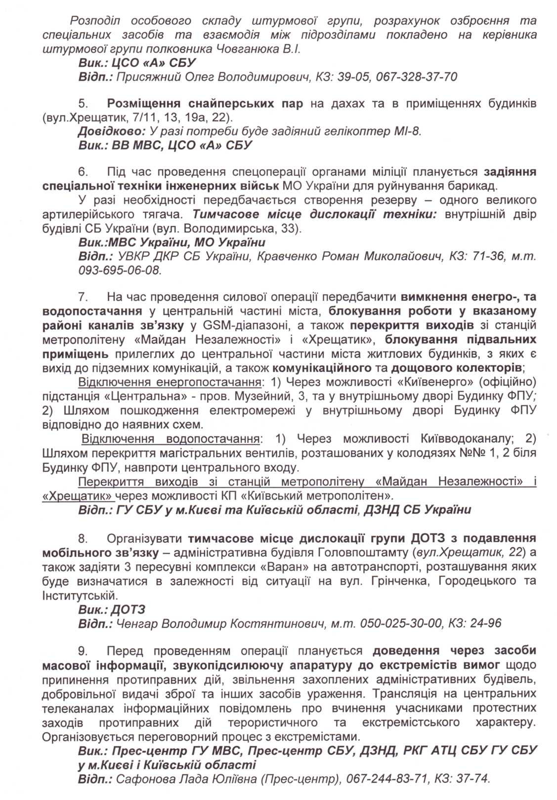 З огляду на це я вирішив оприлюднити частину планів “Хвиля” та “Бумеранг” — документи, які доводять, що снайперами на вул.Інститутській були бійці підрозділу спеціальних операцій внутрішніх військ, яким керує полковник С.Асавалюк, та бійці підрозділу внутрішніх військ “Омега”. Крім того, вказівку на застосування зброї колишній міністр МВС В.Захарченко дав спецпідрозділу ГУБОЗ МВС “Сокіл”. Надаю прізвища та номери телефонів керівників підрозділів, що брали участь у силовому розгоні акцій протесу. На підставі цих даних Генпрокуратура має відкрити кримінальні провадження. Після цього я добровільно передам слідчій групі ГПУ решту матеріалів, які вказують на причетність до кривавих подій міністра МВС В.Захарченка (котрий особисто заявив 20 лютого, що віддав наказ про застосування бойової зброї), його заступника В.Ратушняка, начальника департаменту громадської безпеки МВС О.Крикуна, командувача внутрішніх військ МВС С.Шуляка, в.о. начальника ГУМВС у м.Києві В.Мазана, голови СБУ О.Якименка, його першого заступника В.Тоцького, начальника УСБУ в Києві та Київській області О.Щоголєва, командирів підрозділу СБУ “Альфа”. Допомогу в підготовці спецоперацій МВС та СБУ надавав колишній перший заступник ГРУ Російської Федерації, котрий проживав у готелі “Київ” (його проживання й харчування оплачувала СБУ). Українська влада задіяла фахівця з Росії, оскільки наш очільник СБУ виявився льотчиком, а міністр МВС — ОБХСС-ником. Всі дані росіянина будуть надані Генпрокуратурі, а ступінь його вини хай визначає слідство. Крім того, я готовий передати Генпрокуратурі матеріали, які вказують, що при силовому розгоні акцій протесту МВС та СБУ діяли, як організоване злочинне угруповання.