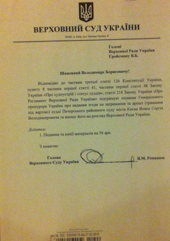 Згоду на арешт суддів Вовка, Кицюка та Царевич підписав голова ВСУ