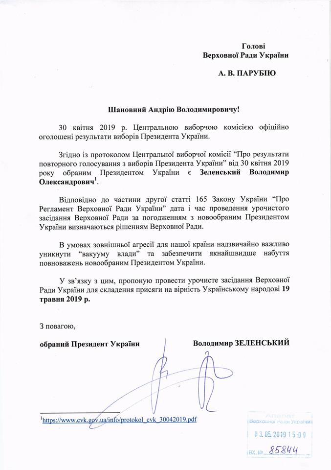 "В условиях внешней агрессии для нашей страны чрезвычайно важно избежать "вакуума власти" и обеспечить как можно скорее обретение полномочий новоизбранным Президентом Украины. В связи с этим, предлагаю провести торжественное заседание Верховной Рады Украины для принесения присяги на верность украинскому народу 19 мая 2019 года", - говорится в документе.