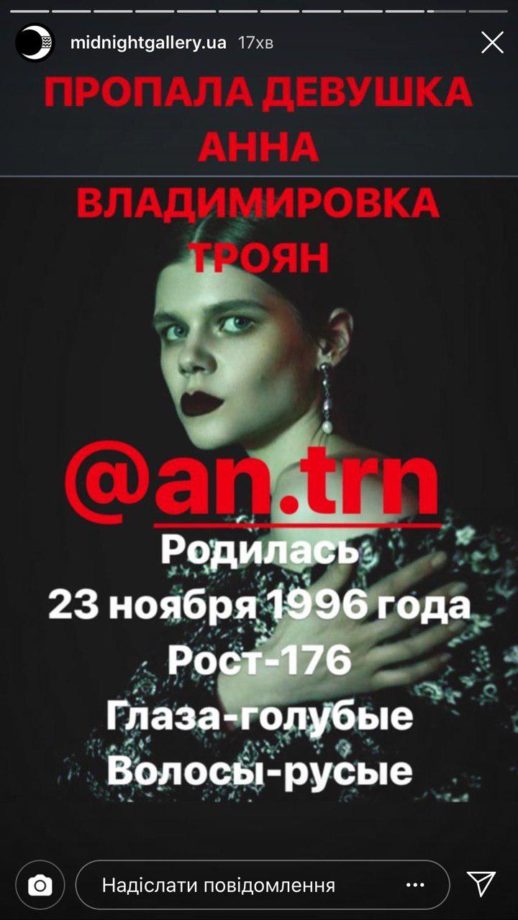 "Кому не безразлично, приходите. Нужно обыскать лес", - пишет парень. Стоит отметить, что Троян принимала участие во 2-м сезоне "Топ-модели по-украински". Она запомнилась зрителям яркой незаурядной внешностью. На шоу модель призналась, что ранее употребляла наркотики. Проект она воспринимала как счастливый билет в новую жизнь.