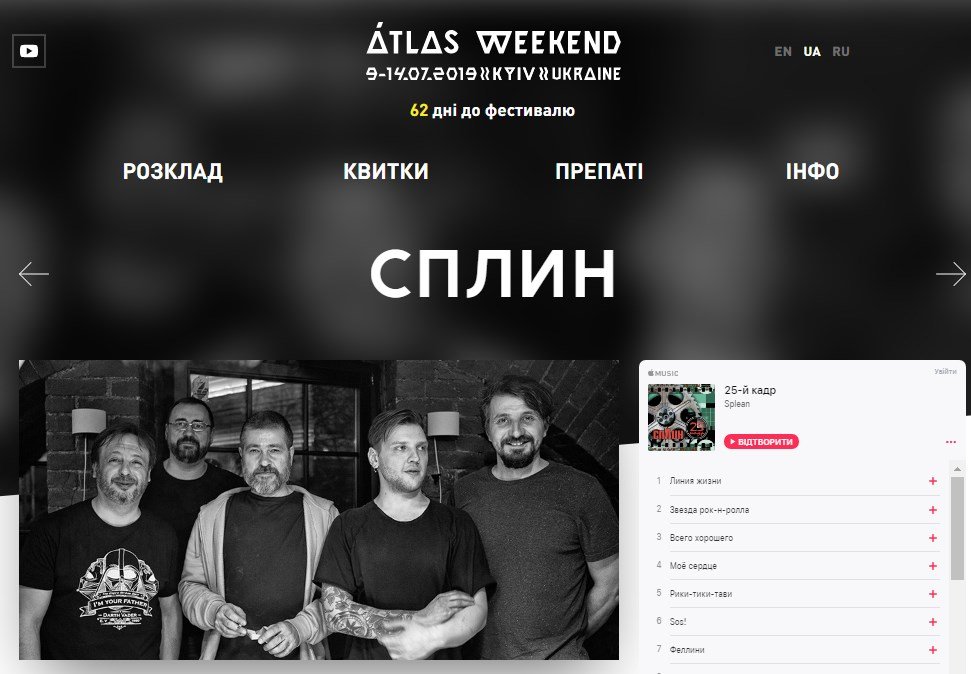 Известная российская группа «Сплин» 12 июля собирается принять участие в киевском фестивале Atlas Weekend в качестве хедлайнера мероприятия. Об этом сказано на странице в Facebook организаторов.