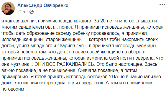 “Я, як священик, прийму сповідь кожного. За 20 років я багато чув і багатьом свідком був… Зрозумів. Я приймав сповідь жінки, яка, щоб дати освіту своїй дитині, продавалася. Я приймав сповідь жінки, старої жінки.., яка щоб нагодувати своїх дітей, вбила молодшого і зварила суп”,– написав він.