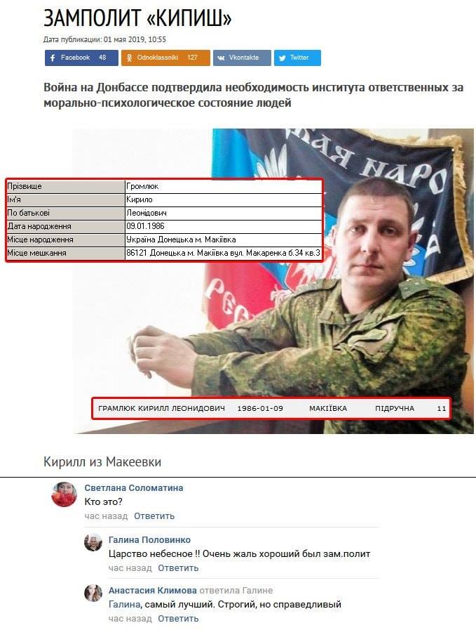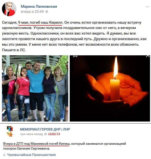 “9 мая пополнилась очередным бойцом Громлюк “Кипиш” Кирилл из Макеевки. ДТП между Донецком и Макеевкой. 5 омсбр. Все будет Украина и победа за нами!” – говорится в сообщении.