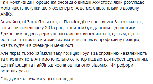 "Такие возможные действия Порошенко очевидно выгодные Ахметову, который рассматривает возможность покупки еще 5 облэнерго. А это возможно, только с разрешения АМКУ. Конечно, ни Загребельская, ни Панаиотиди не являются "людьми Зеленского". Они были призначенны еще в 2015 году, когда он был далек от политики. Единственное чем эти двое гос уполномоченных отличаются, это тем, что не боялись идти против системы и занимать независимую профессиональную позицию, даже будучи в очевидном меньшинстве", - подчеркнул Герус.