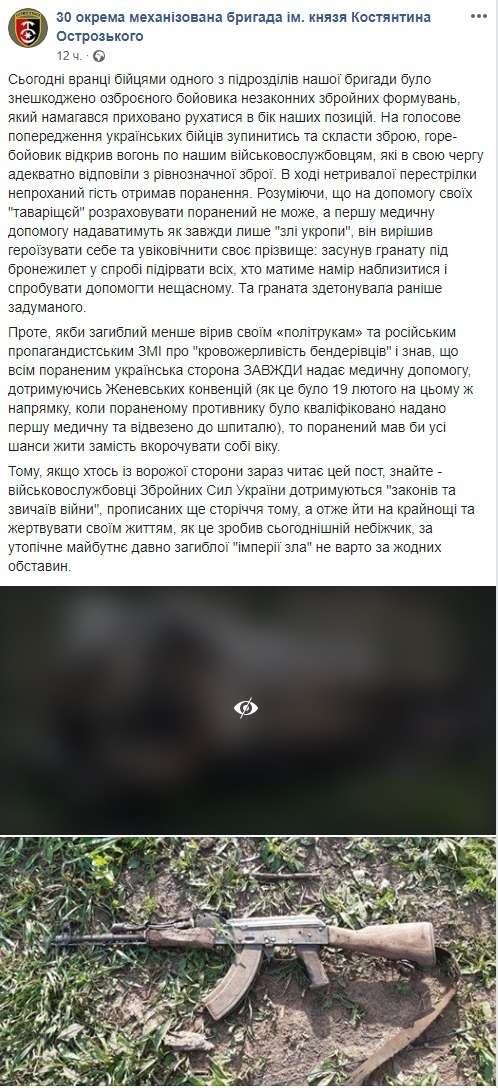 При этом бойцы ВСУ напоминают, что всегда соблюдают Женевские конвенции, в т. ч.оказывая медицинскую помощь пострадавшим противникам. Так, 19 февраля военнослужащие этой же бригады не только помогли раненому боевику, но и доставили его в госпиталь.