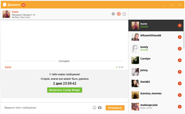 У якості курйозного випадку новий користувач навіть може отримати повідомлення від різних людей з однаковою фотографією. Але тут, скоріше за все, має місце помилка програмістів, які не налаштували алгоритми. Отримуючи повідомлення від бота, користувач бачить лише заголовок: подивитись текст, відповісти або вивчити сторінку відправника можна лише за гроші після оформлення платної підписки і підключення додаткових сервісів. Хоча варто зазначити, що й це виявляється марною витратою грошей – боти не настільки розумні, щоб продовжувати переписку.