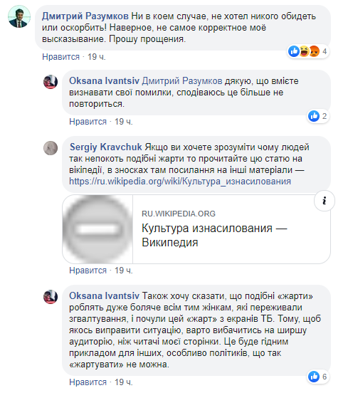 Так, Разумков ответил на вопрос «стоит ли насиловать Верховную Раду»: «Идти на изнасилование точно не надо, да и «девушка «так себе». Эта шутка возмутила правозащитников и феминисток.