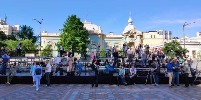 Для прессы на площади Конституции соорудили огромную трехуровневую зону.